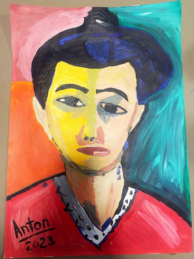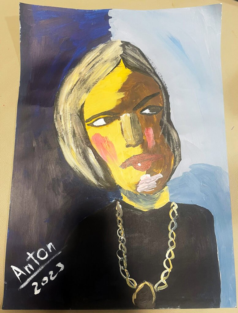 This portrait is structured through tension rather than symmetry. The face is divided by color, but the division is emotional, not formal. Warm tones collide with cooler fields, creating a surface that feels unstable — as if the figure is caught between presence and withdrawal.