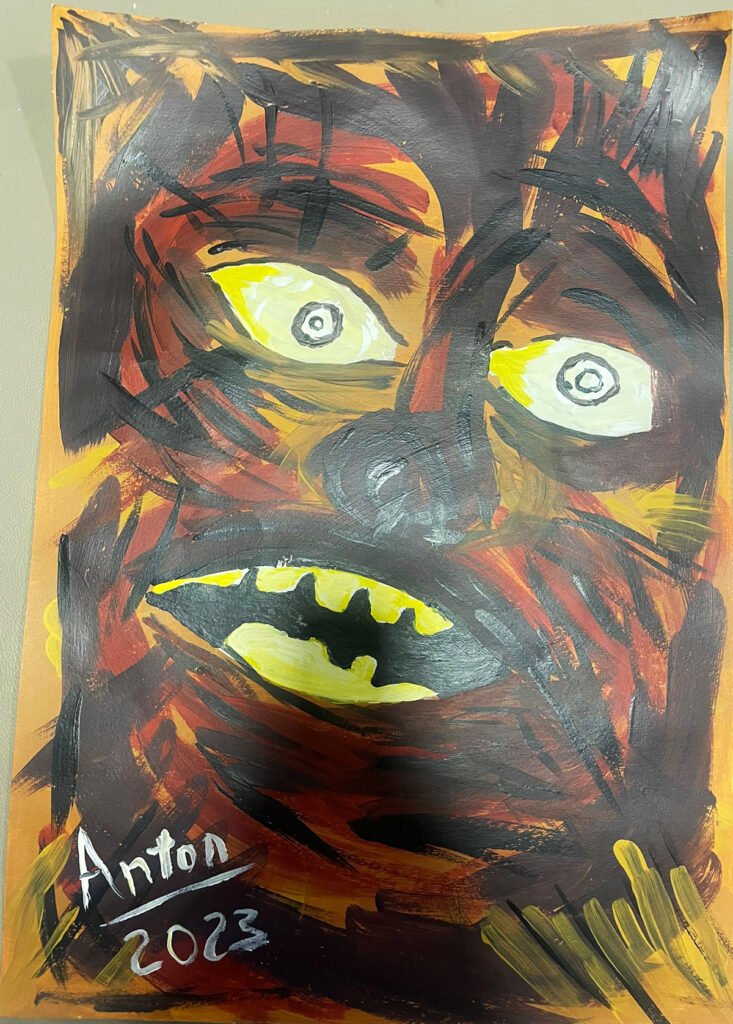 Color is aggressive and immediate. Yellow burns through the darkness like alarm or fear. Black and red collide, layered in hurried strokes that refuse refinement. There is no background space to escape into; the figure fills the frame, confrontational and unavoidable.